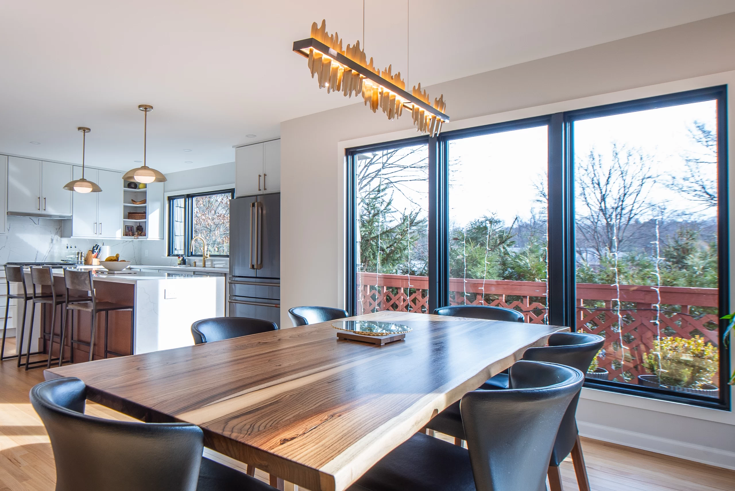 Distinctive pendant lighting fixtures were chosen to cast inviting warmth over both the bar and the kitchen island, enhancing the intimate, welcoming atmosphere of the room. These design details elevated the entertainment potential of the kitchen, creating an inviting space for gatherings and celebrations.