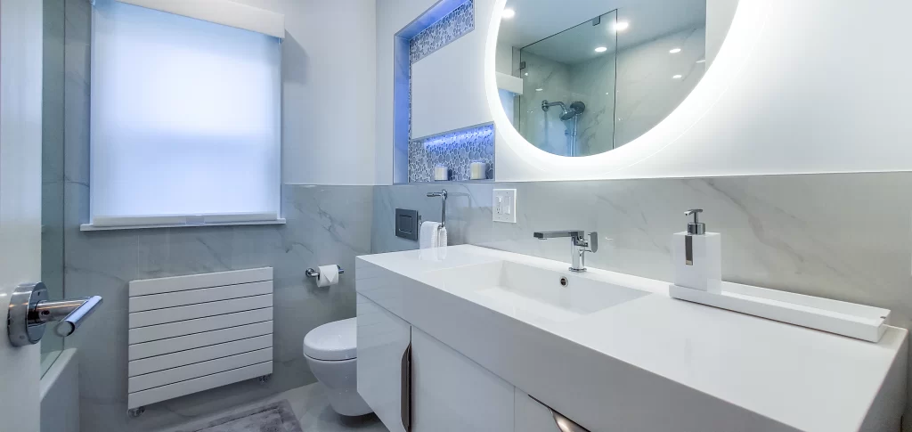 Above it, a rounded LED-backlit mirror introduces a gentle curve that offsets the linear design elsewhere in the room. It adds warmth, depth, and a soft ambient glow that enhances both function and atmosphere.