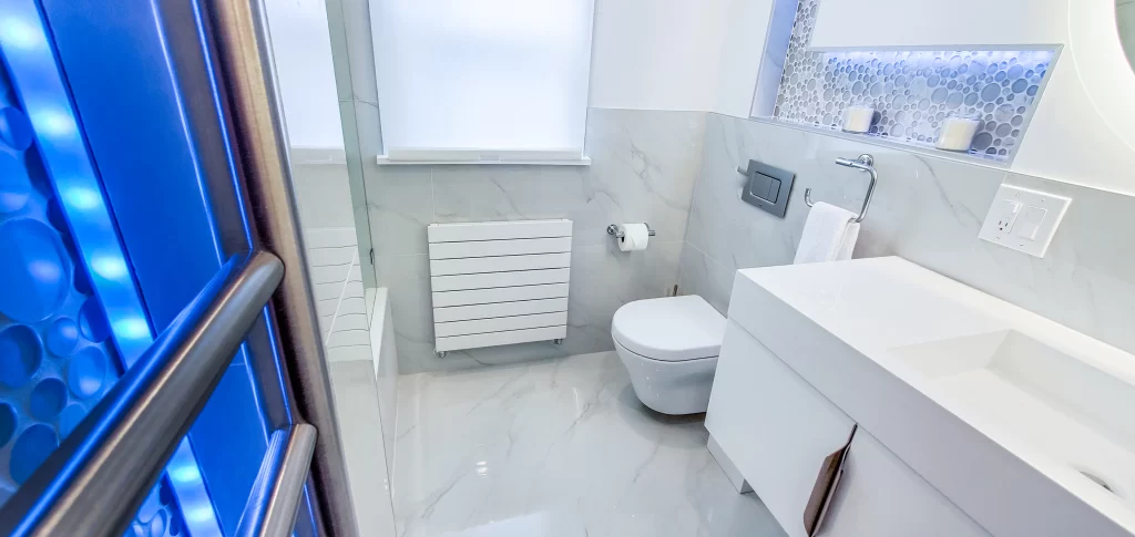 Above the toilet, we introduced a custom U-shaped recessed niche, softly illuminated with blue LED lighting. This feature adds depth and a subtle architectural glow, turning a typically overlooked area into a design moment.