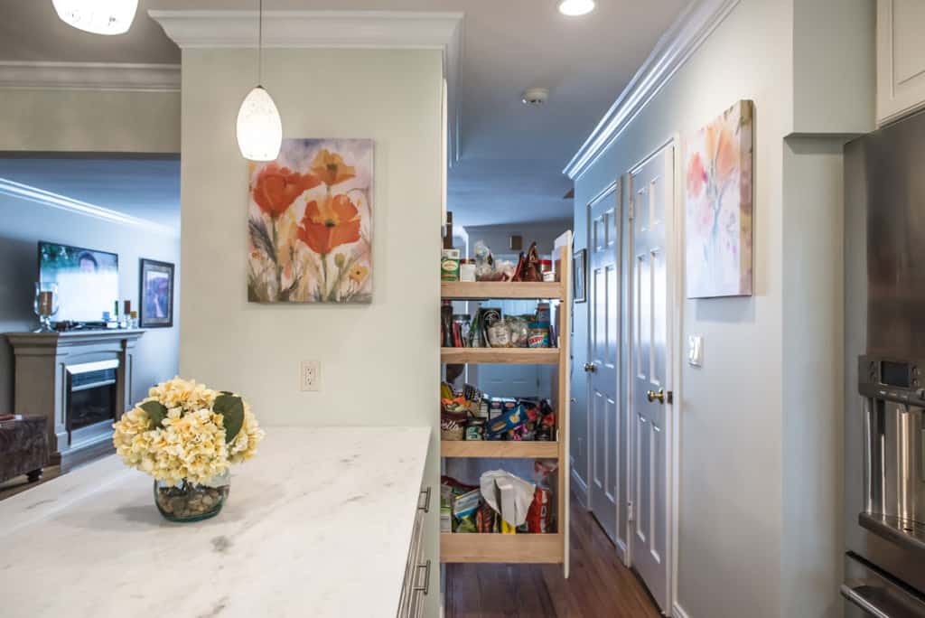 Storage was planned around daily habits rather than standard layouts. A dual-bin recycling system was designed to function independently and placed precisely where plumbing and electrical allowed, freeing up valuable cabinet space elsewhere.