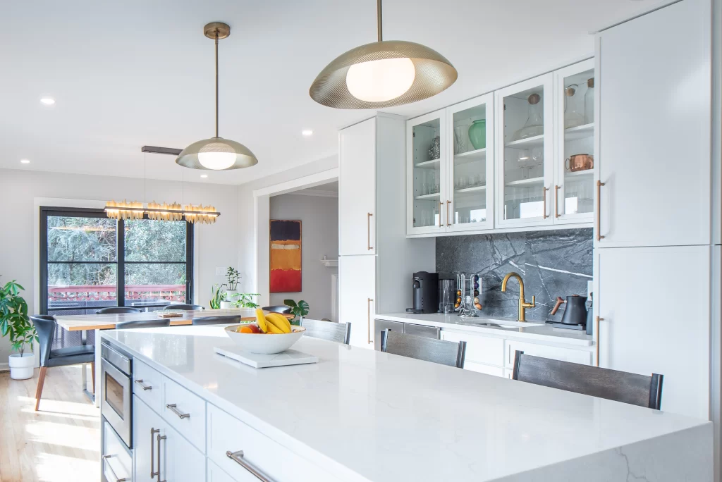 Under-cabinet lighting and selective glass cabinetry balance the white finishes with the home’s existing wood-toned furniture, keeping the space contemporary without disconnecting it from the rest of the house.